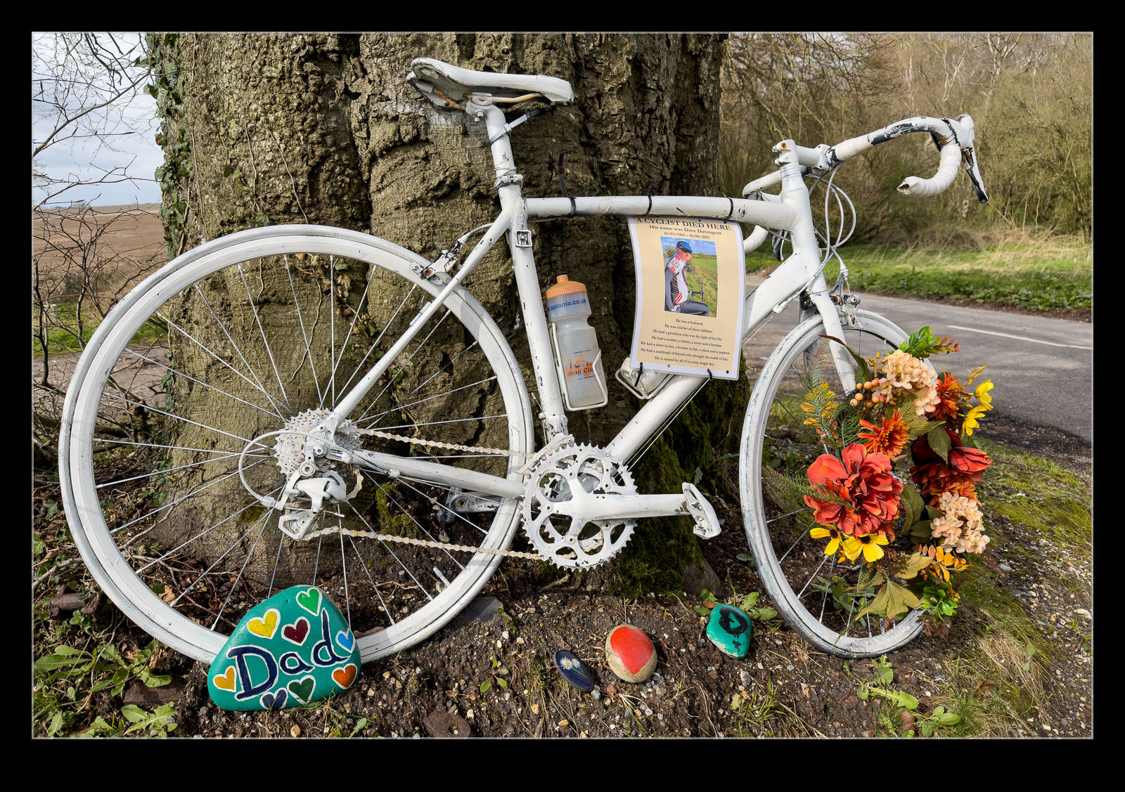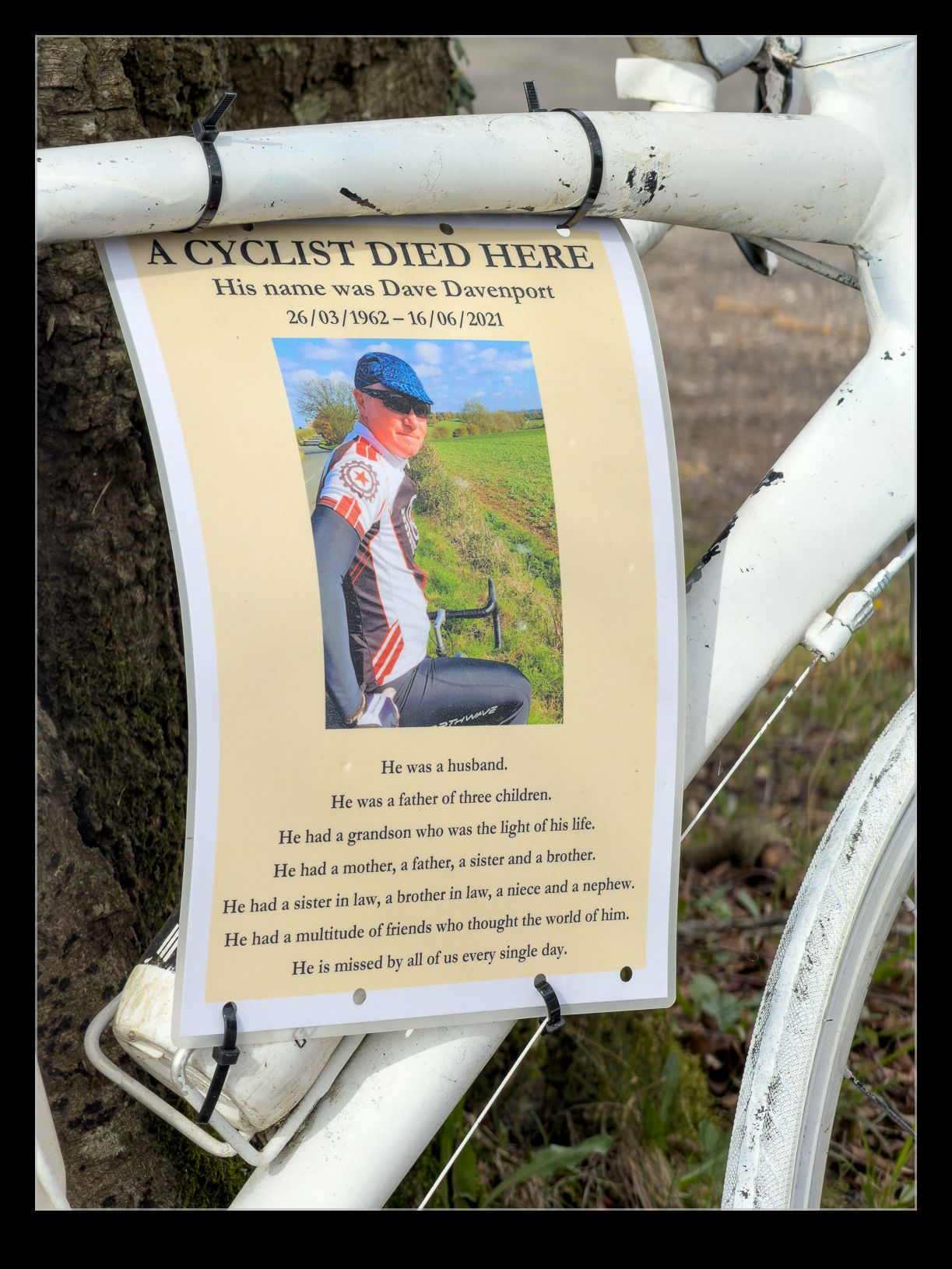 As we were driving towards Sparsholt, we came along a lane that I often cycle. At a junction, there was a white painted bike against a tree. It looked like a memorial, but we were in the car so there was nothing much to be done. However, it wasn’t too long before I rode back up this way on my bike. This time I was able to stop. The bike is a memorial to a cyclist that lost their life. There was a message with details of Dave Davenport. As a cyclist, I am very conscious of how vulnerable we are to the inattention of others with whom we share the road. This could be any of us.