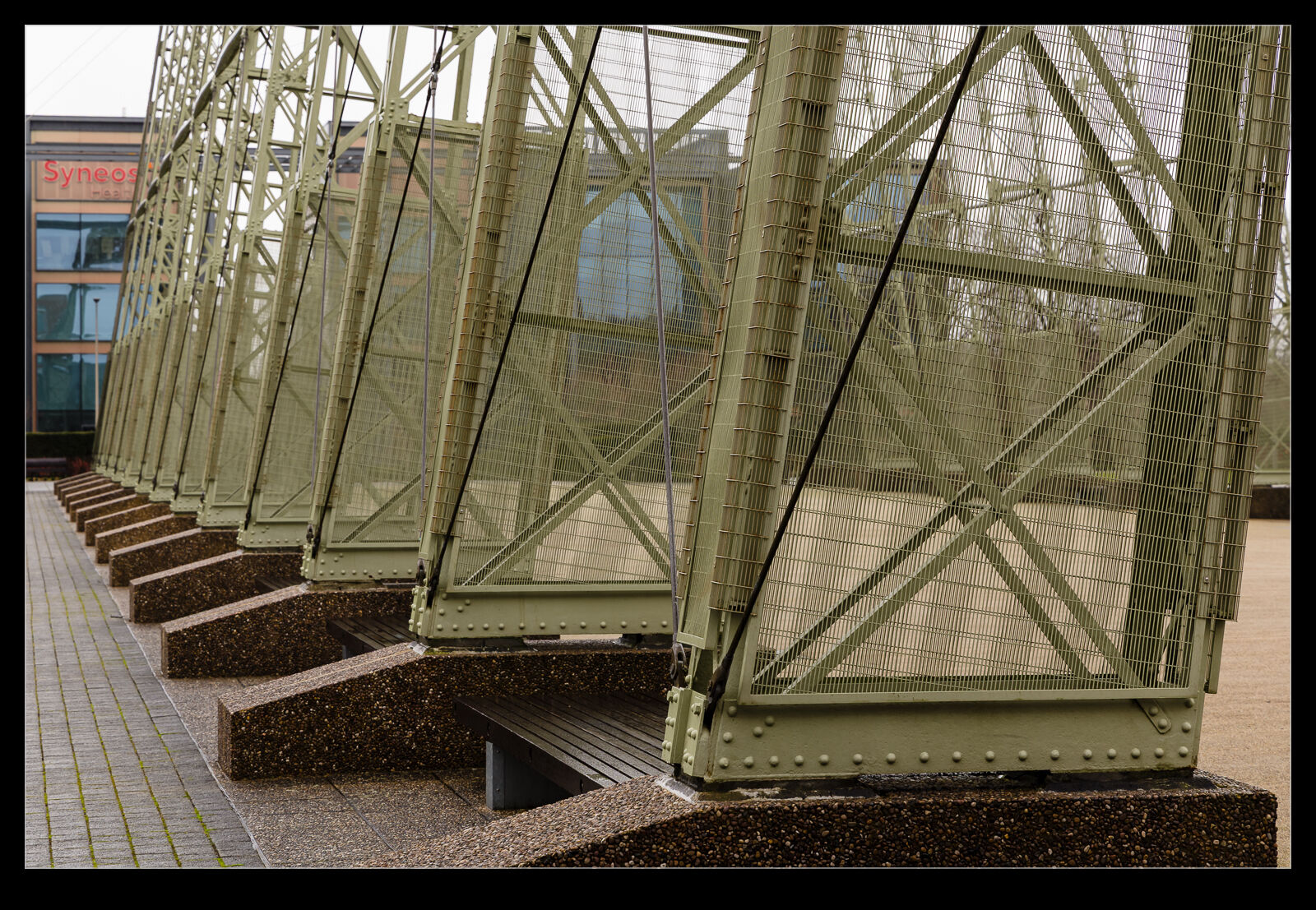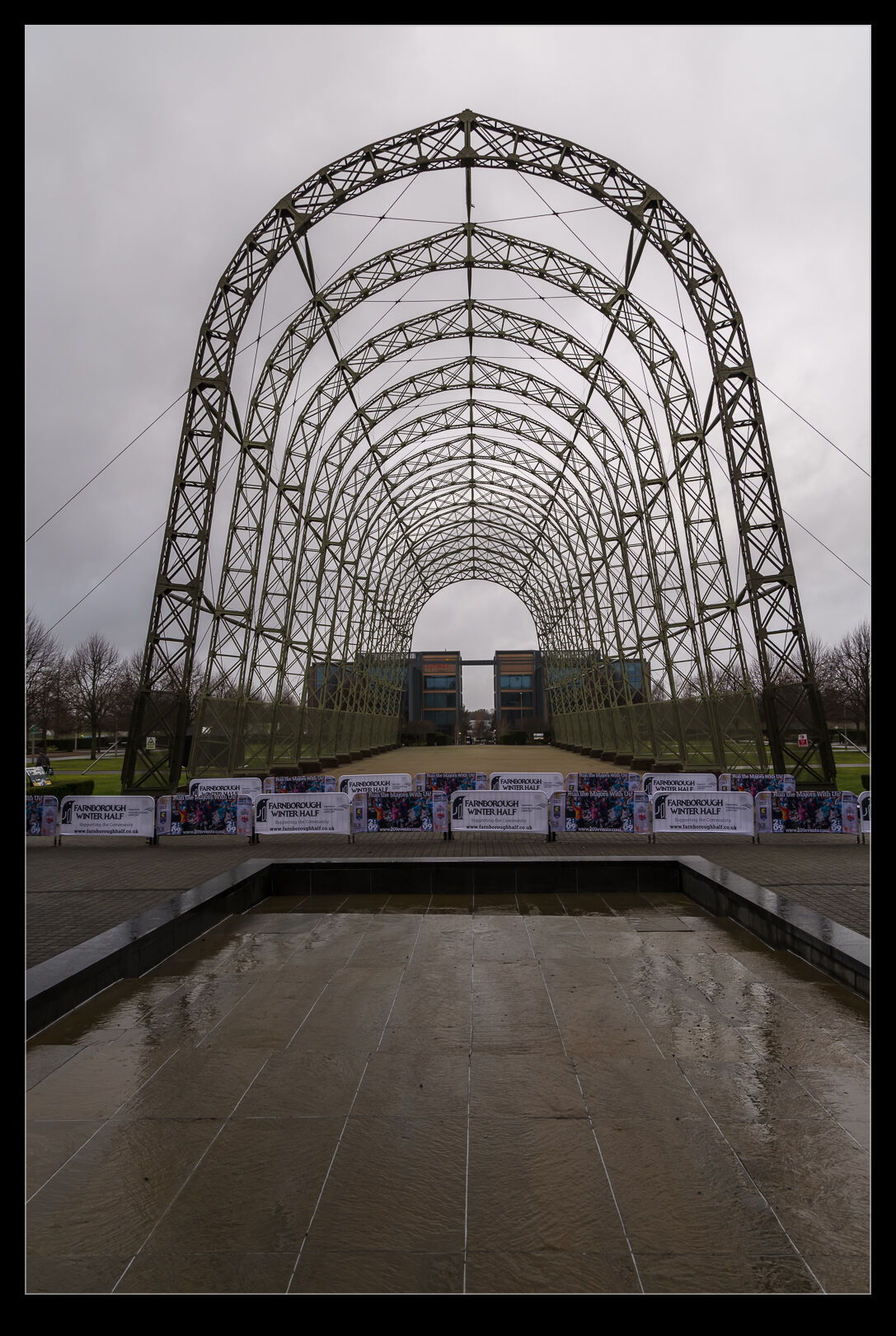 Aside from the buildings at Farnborough, there is also the frame from a balloon hangar. This was a fabric covered structure with the fabric having been lost in a storm many years ago. I read that the frame was previously in another location but was moved to this space as part of the redevelopment of the site. Some elements needed repair or replacement but much of it is original. It was repainted and assembled with some minor additions to prevent people climbing the structure. On a gloomy day, I decided a combination pano and HDR was needed to record it. Not anything like the grand scale of the hangars at Moffett Field I used to see but still cool.