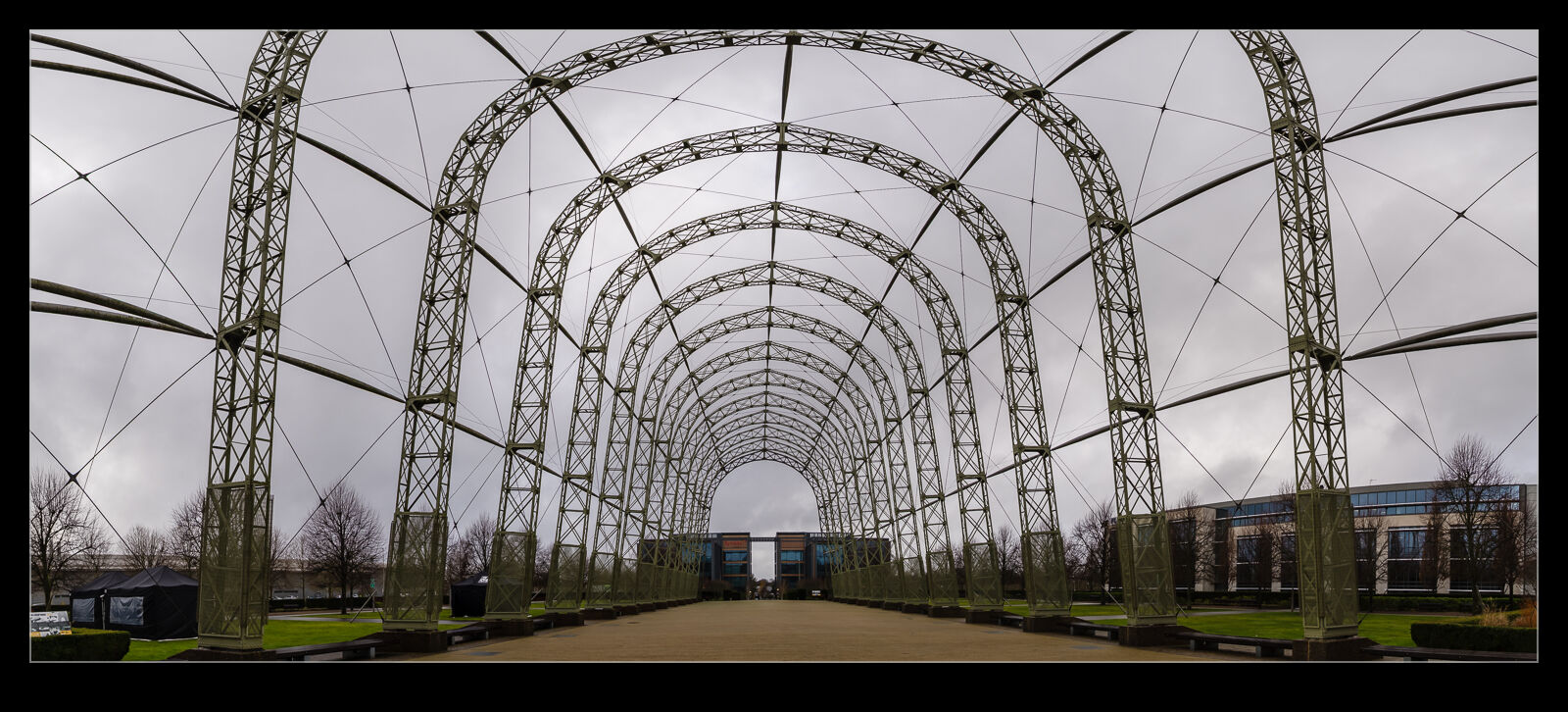 Aside from the buildings at Farnborough, there is also the frame from a balloon hangar. This was a fabric covered structure with the fabric having been lost in a storm many years ago. I read that the frame was previously in another location but was moved to this space as part of the redevelopment of the site. Some elements needed repair or replacement but much of it is original. It was repainted and assembled with some minor additions to prevent people climbing the structure. On a gloomy day, I decided a combination pano and HDR was needed to record it. Not anything like the grand scale of the hangars at Moffett Field I used to see but still cool.
