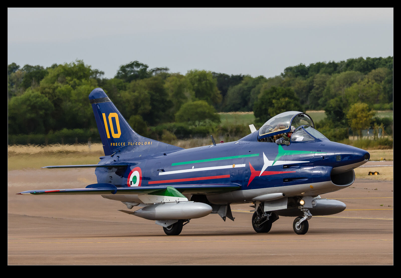 With the team getting ready to transition to the M346 before too long, it was an interesting comparison to have RIAT include a recently restored G91 display in Frecce colours. I think the original team jets has a pointed nose rather than the camera port on the majority of production aircraft, so I doubt this is an original team aircraft, but it is still something special to see. It did fly in formation with the M346 which is a nice before and after idea although not with the current team which would have been even better. Here is a selection of images of it from across the weekend of RIAT.