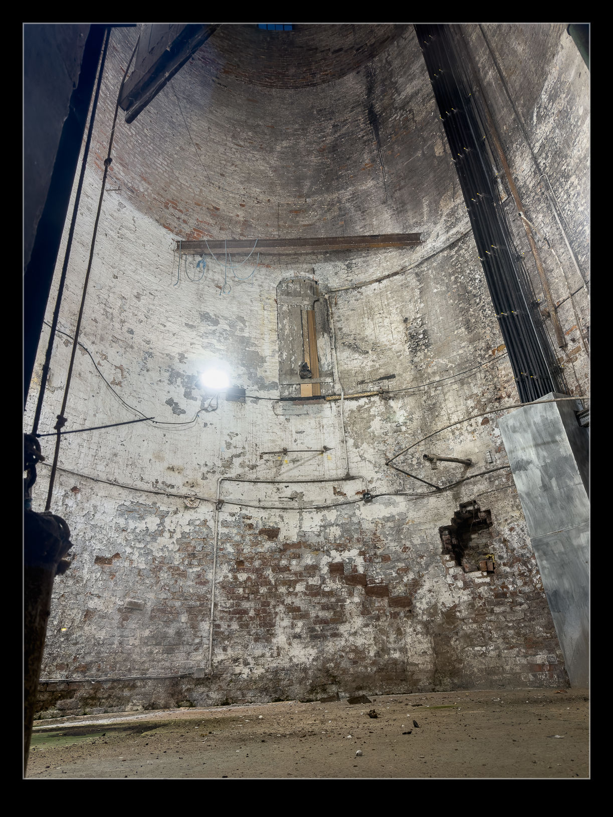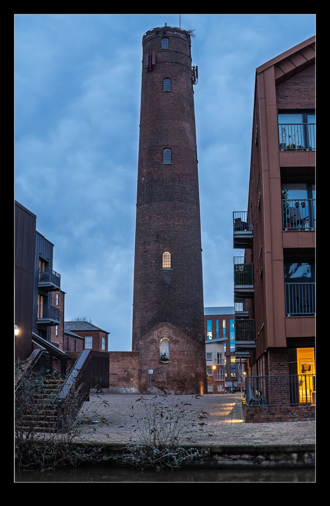 Production techniques evolved over time and towers like this became redundant. Fortunately, this one has not been demolished and now it looks over the new apartment developments along the canal. The inside is illuminated and, while there is a window looking in, there is not much to be seen. I hope it is well looked after and will remain for many years to come.