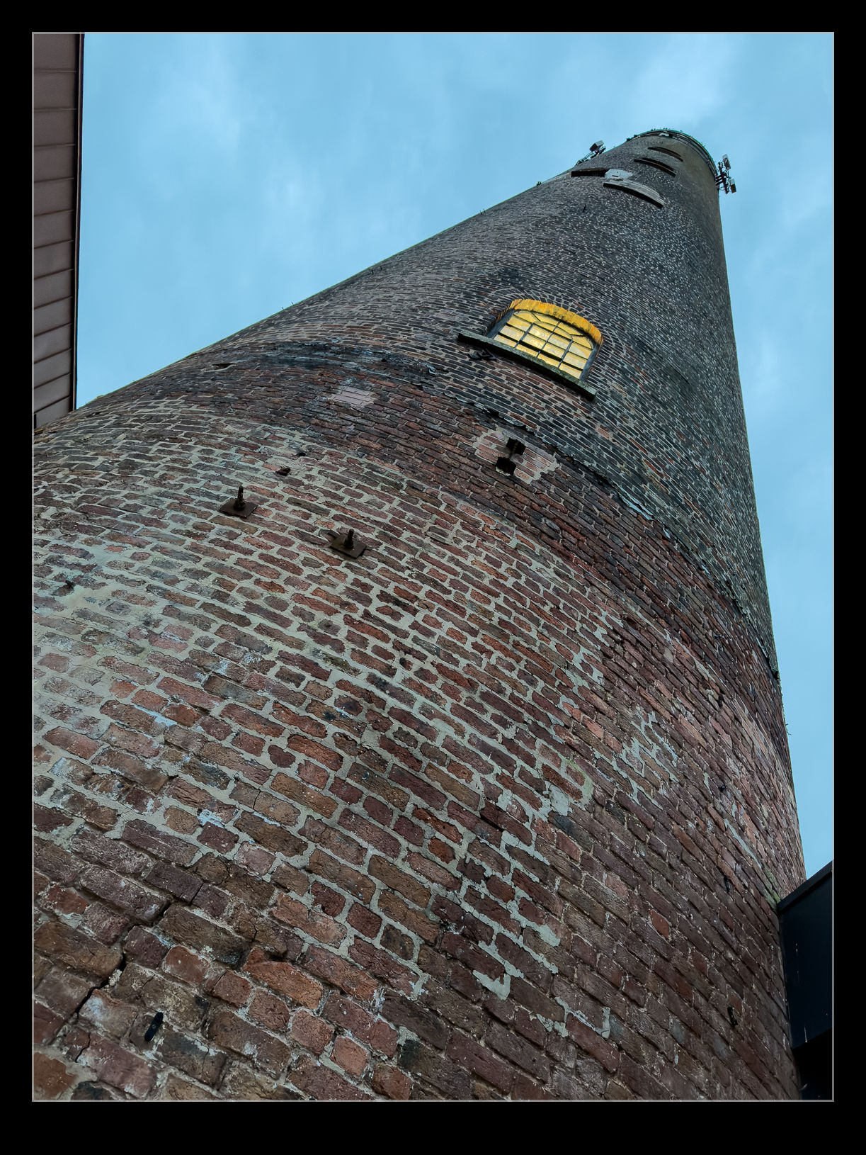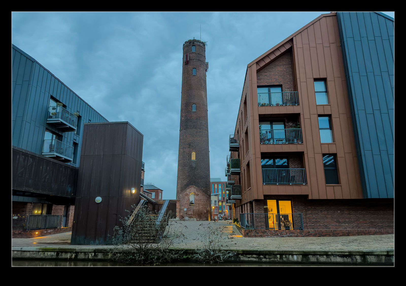 Production techniques evolved over time and towers like this became redundant. Fortunately, this one has not been demolished and now it looks over the new apartment developments along the canal. The inside is illuminated and, while there is a window looking in, there is not much to be seen. I hope it is well looked after and will remain for many years to come.