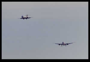 Sometimes, the jets are a bit further apart but, when they first line up, they overlap in the distance. Other times they seem to start out further apart but you know that the perspective is off and they will end up close together. I guess this was just a lucky day. It is good to have lens options on an occasion like this. My longest lens is a prime. It works well for many things at SFO but, when the jets are close together, they will usually end up being too much for the lens. Having a second zoom to hand is ideal in that case.