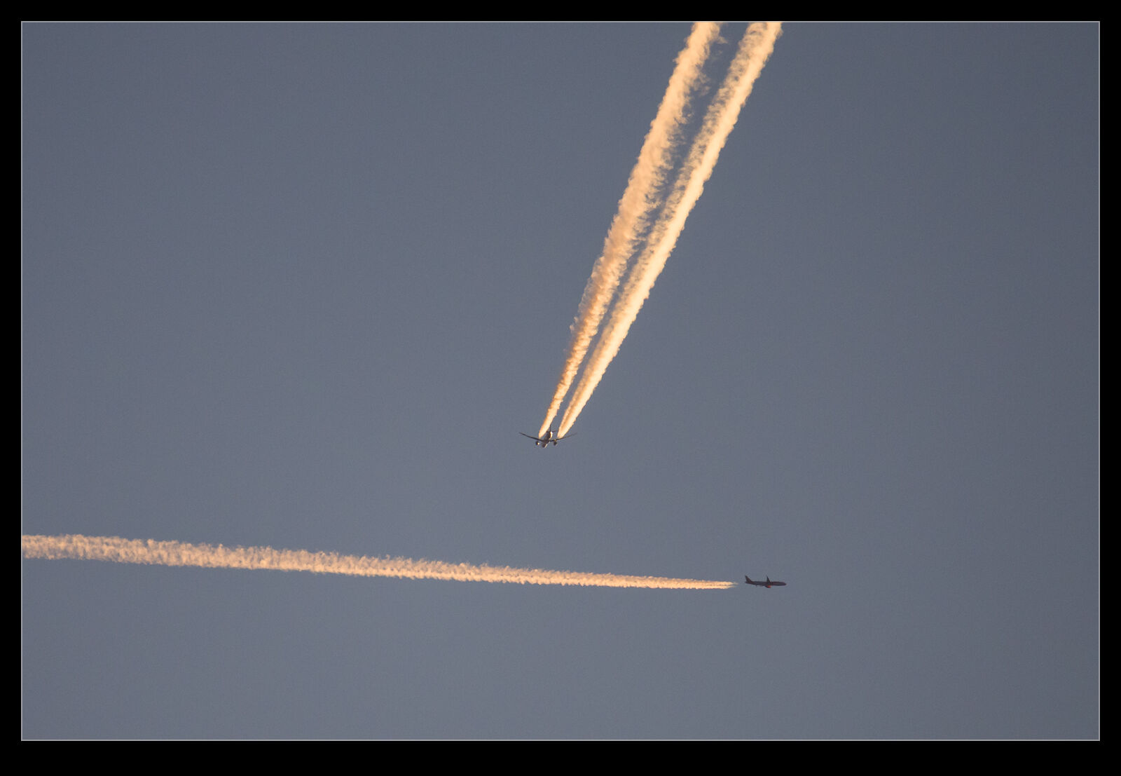 Another of my early morning walks and I looked up at an aircraft contrailing across the sky above me. The low sun angle made the textures of the contrail look good, so I took a few shots. A short while later, I realised that its direction of travel was taking it towards another jet that was crossing its path. I was hoping for the relative positions of the two jets to look like a perfect cross from where I was standing but it wasn’t to be. Even so, they did look like they were crossing quite close.