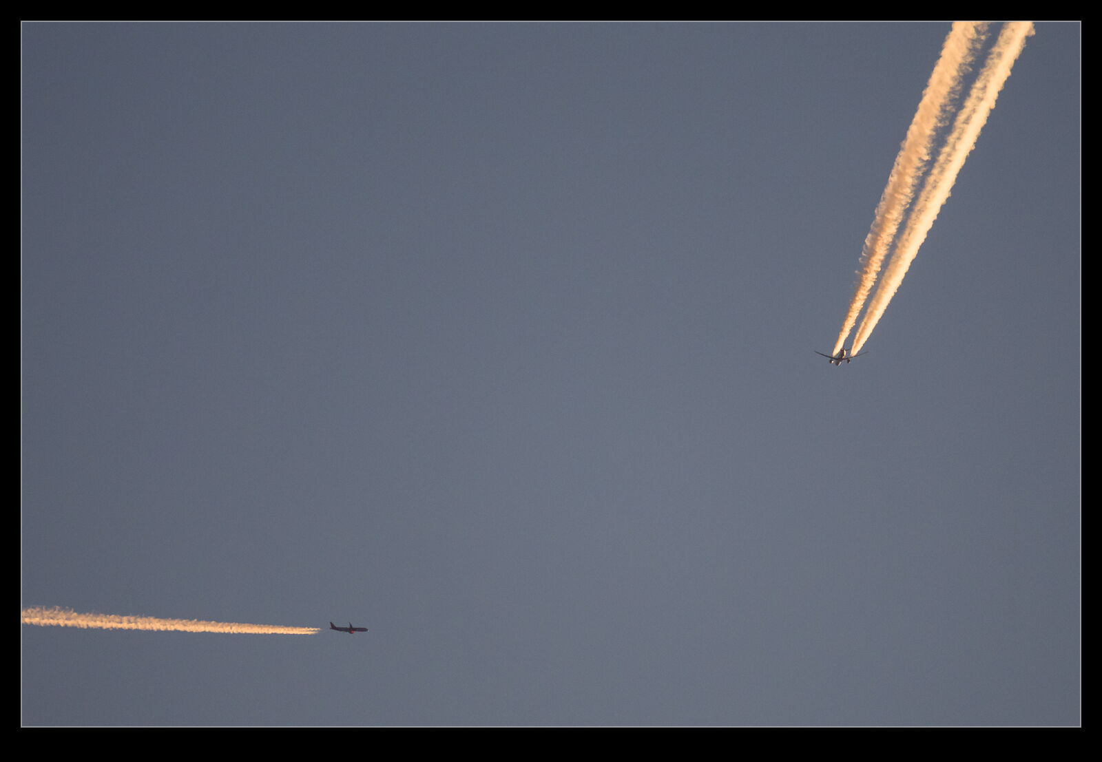 Another of my early morning walks and I looked up at an aircraft contrailing across the sky above me. The low sun angle made the textures of the contrail look good, so I took a few shots. A short while later, I realised that its direction of travel was taking it towards another jet that was crossing its path. I was hoping for the relative positions of the two jets to look like a perfect cross from where I was standing but it wasn’t to be. Even so, they did look like they were crossing quite close.