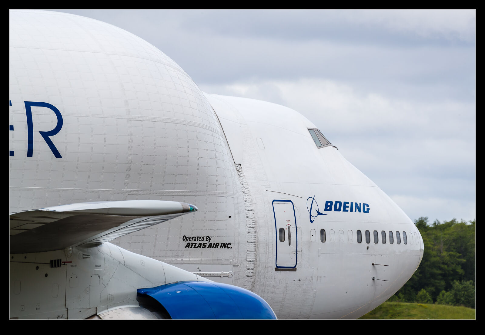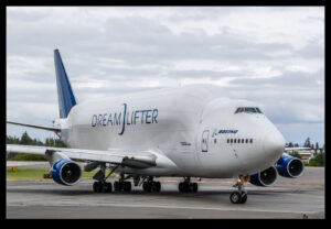 When planes are arriving at Paine Field from the north, I am usually up near Future of Flight. However, I was down at the south end when a Dreamlifter came in. They used the full length of the runway and turned on to the taxiway when they reached the end. This meant I got a good chance to shoot the plane from a place I had not done before. The weather was overcast which actually helped to show some of the textures associated with the modifications that the base 747-400 had received.