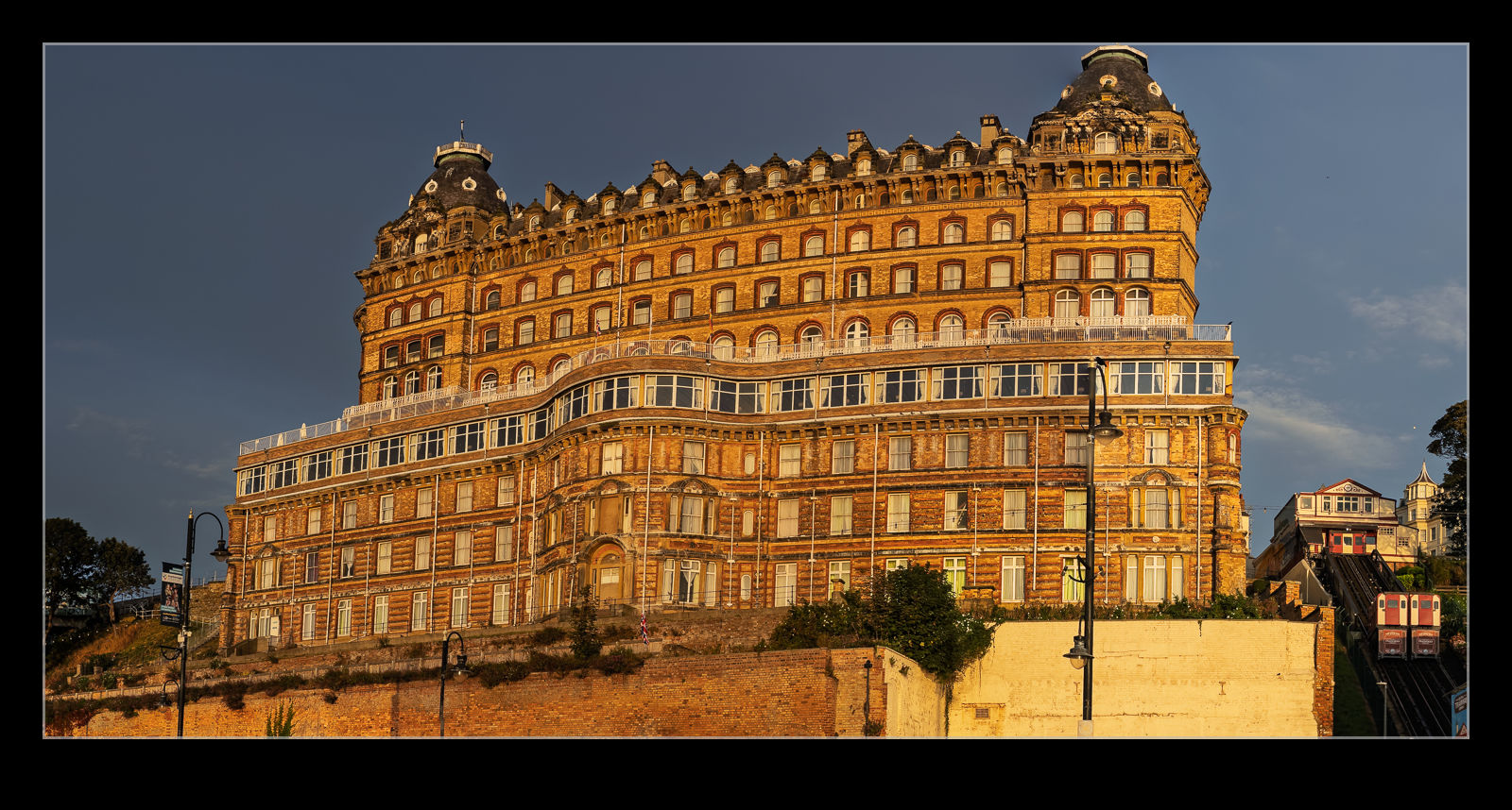 The early morning in Scarborough means the light is coming off the water so the waterfront is illuminated. The Grand Hotel is the dominant feature of the skyline, and it was nicely lit. I am told the outside is better than the inside and was happy to stay out here.