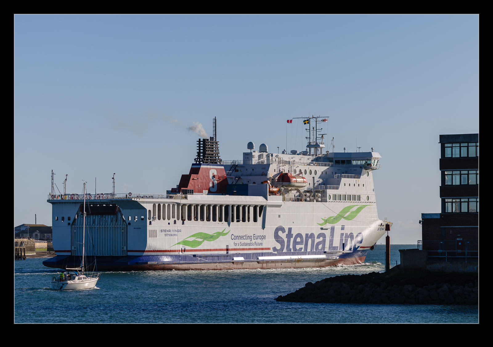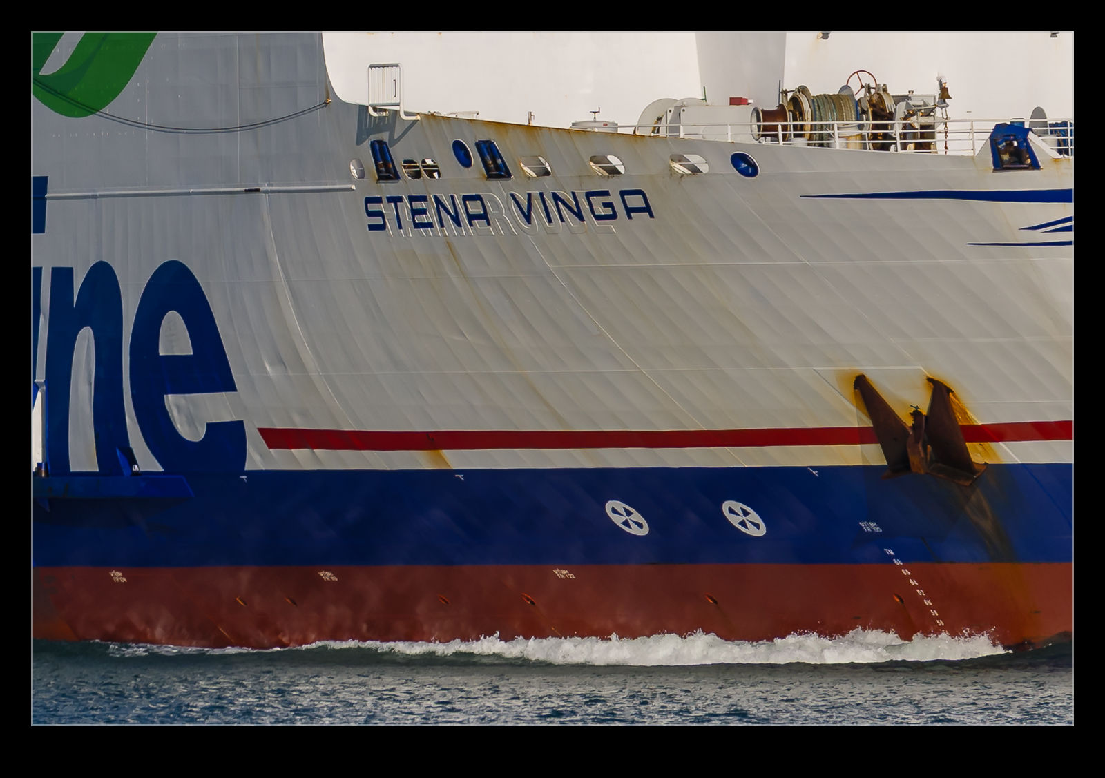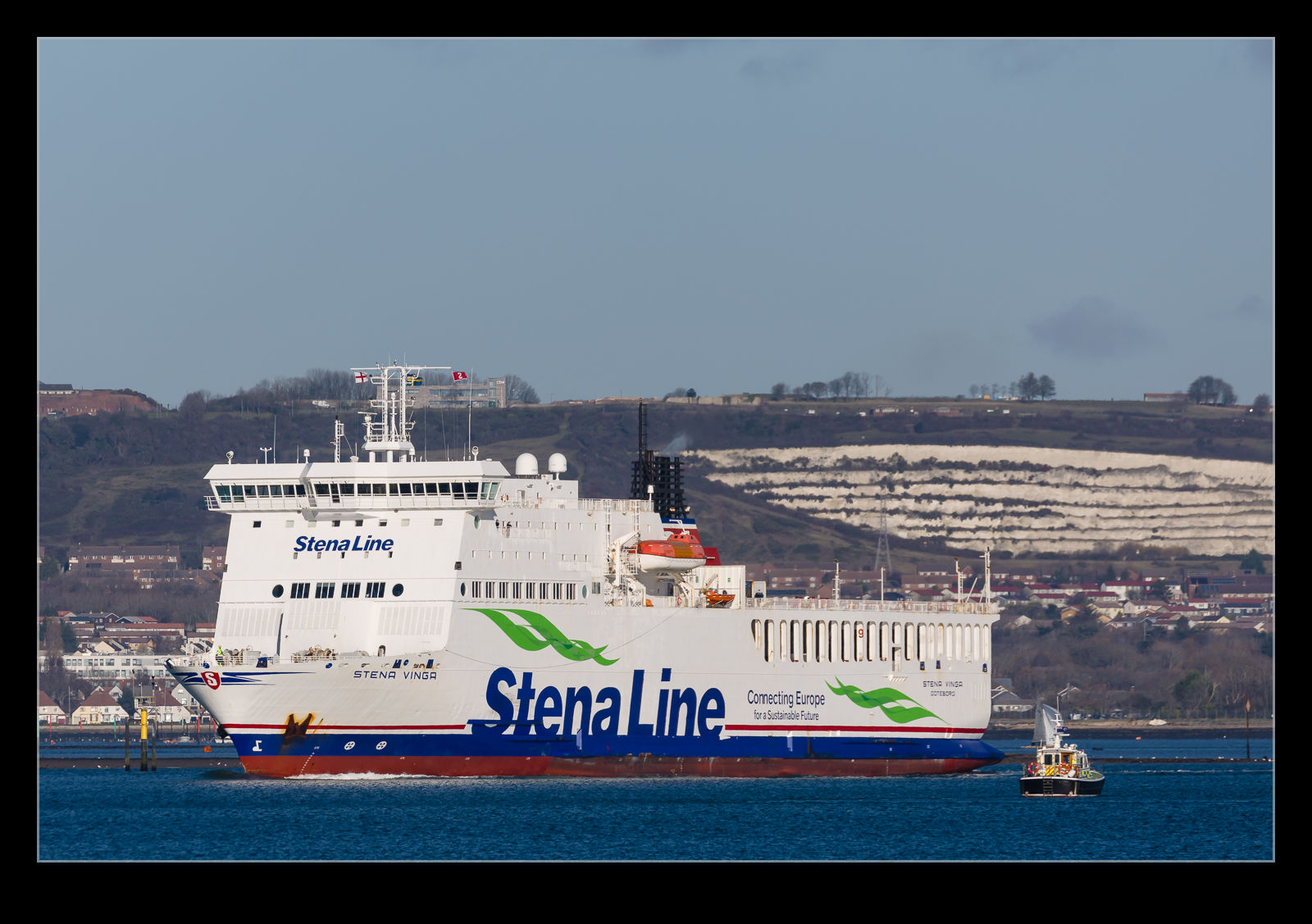 While we were standing along the shore in Gosport awaiting the arrival of the HMS Prince of Wales, the normal traffic from Portsmouth was going about its business. A DFDS ferry was heading out to cross the channel to Jersey. Judging by its shape, it can accommodate a higher mix of freight. It doesn’t look like the regular cross channel ferries that resemble cruise ships these days! As it came closer, there appeared to be a different name built into the side of the hull. The name Stena Vinga had been painted over the top of the original name, but you could still see it. Hammerodde was its name before it was acquired by Stena and they have chartered it to DFDS apparently.
