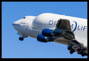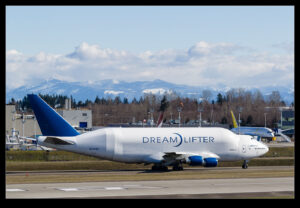 When planes are arriving at Paine Field from the north, I am usually up near Future of Flight. However, I was down at the south end when a Dreamlifter came in. They used the full length of the runway and turned on to the taxiway when they reached the end. This meant I got a good chance to shoot the plane from a place I had not done before. The weather was overcast which actually helped to show some of the textures associated with the modifications that the base 747-400 had received.